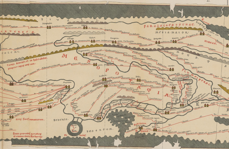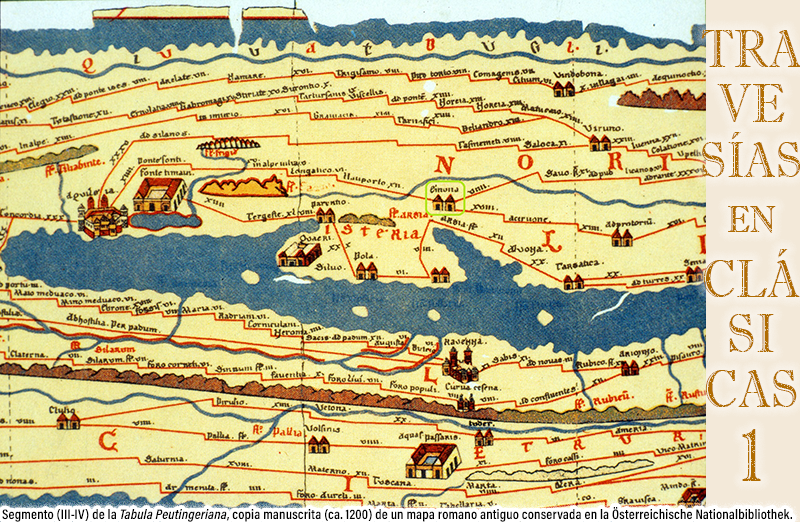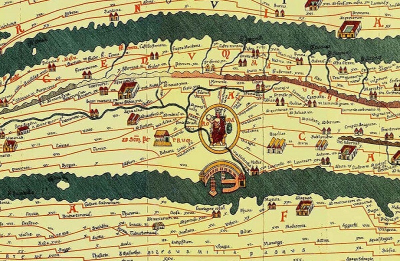 Segmento (IX) de la Tabula Peutingeriana, copia manuscrita (ca. 1200) de un mapa romano antiguo conservada en la Österreichische Nationalbibliothek.
